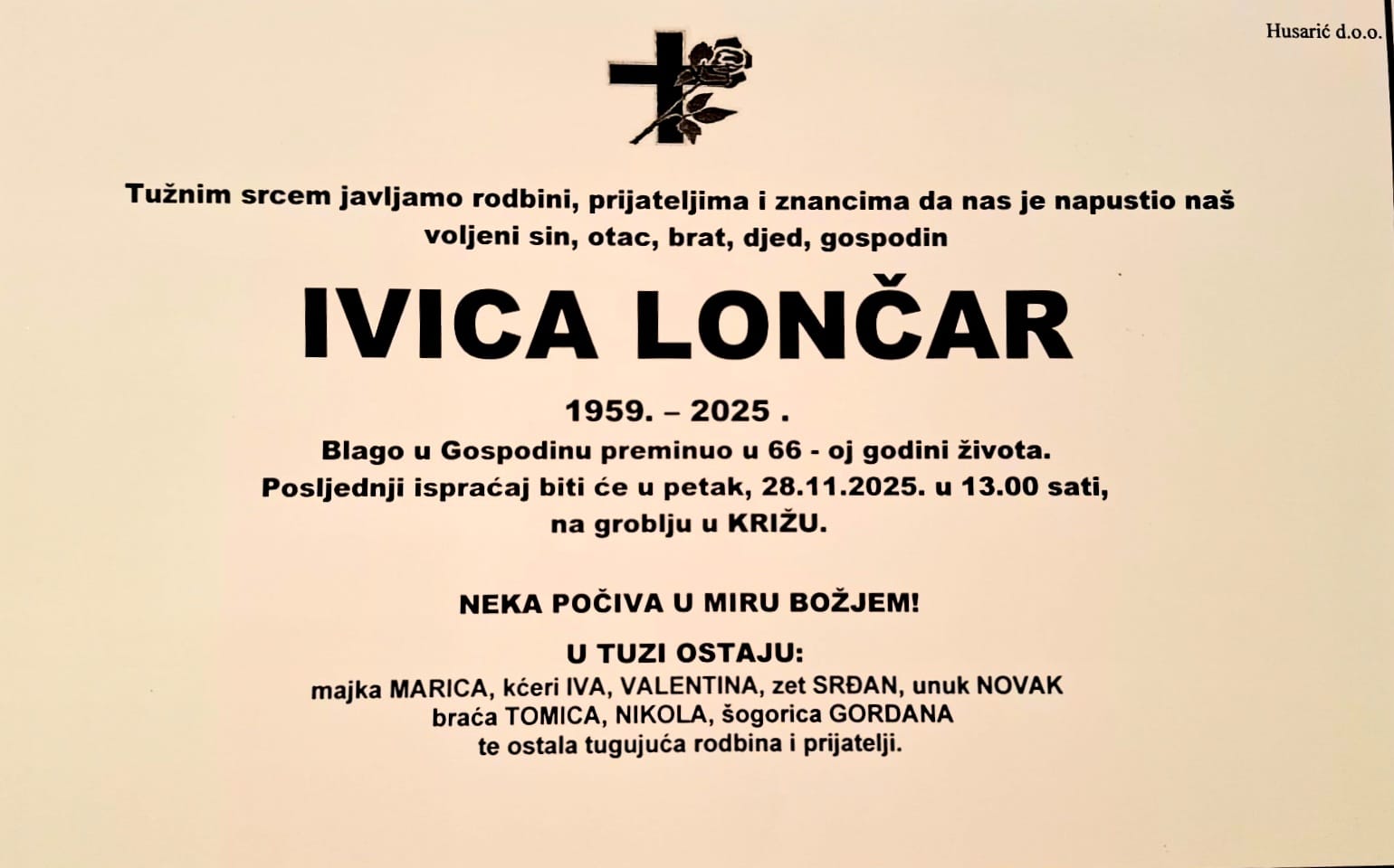 Sprovod pokojnog Ivice Lončara biti će u petak 28. 11. 2025. godine u 13:00 sati na groblju u KRIŽU.