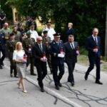 Nakon svečanog čina polaganja vijenaca i paljenja svijeća uslijedio je mimohod predvođen ratnim zastavama do Spomen obilježja gdje je započeo središnji dio svečanosti donošenjem državne zastave koju su donijeli pripadnici policijske motorizirane jedinice.